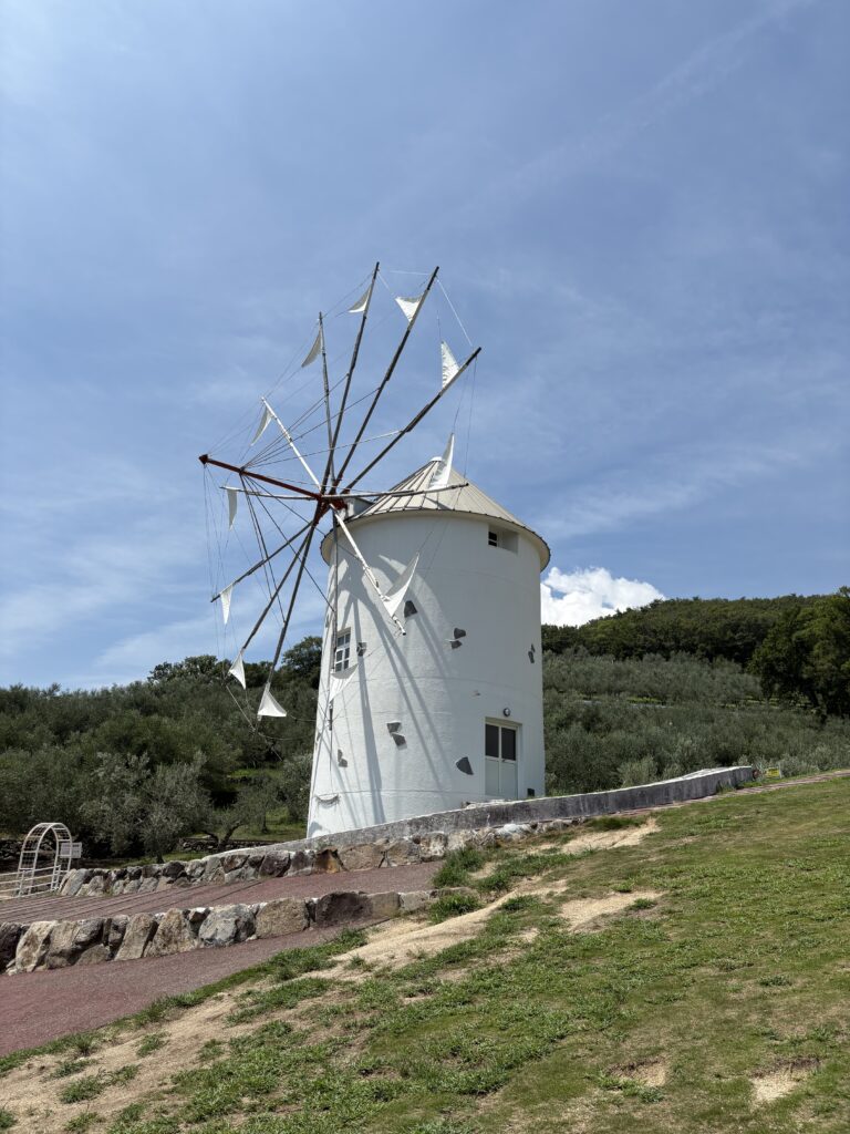 ここは約2000本のオリーブ畑に囲まれた道の駅公園で、公園内にある白いギリシャ風車が有名です。