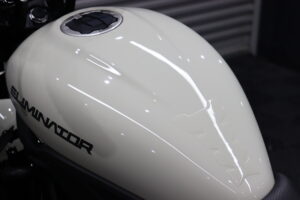 カウル部分には手塗りで丁寧にコーティングを行い、その他の外装部分にはスプレーガンによる吹付施工を行いました。ガン吹き施工のメリットは、手の届きにくい細かい部分にもムラなく均一に塗布できることです。エンジンパーツ等、通常では手の入りにくい箇所も可能な限り隅々まで塗り込むことができます。