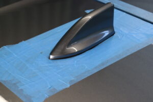 今回は、シャークアンテナは取り外さず、マスキングテープで正確に型取りを行い、形状に合わせてフィルムをカットしていきます。