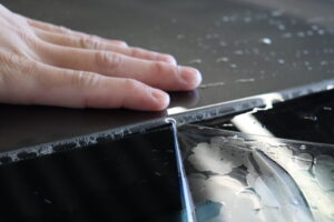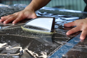下地処理後、専用施工液を使用しながらフィルムをインストール。